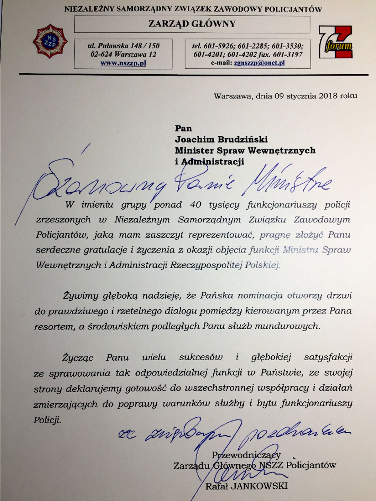 List gratulacyjny z okazji objęcia stanowiska Ministra Spraw Wewnętrznych i Administracji