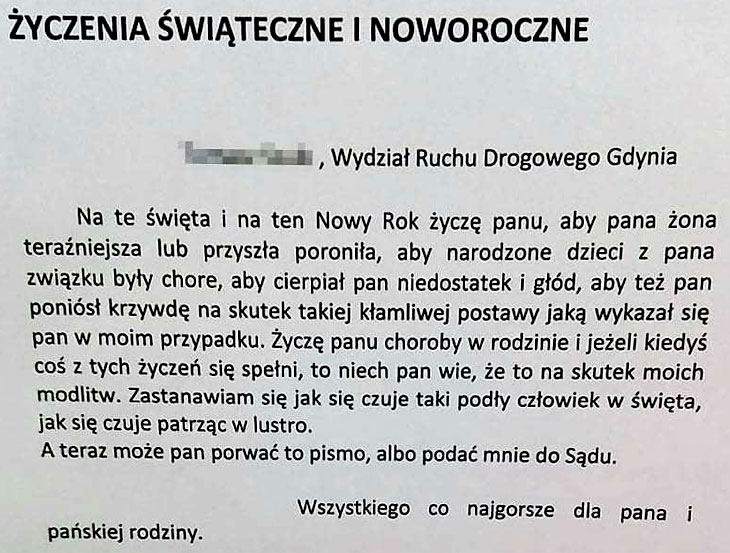 Funkcjonariusz otworzył go w obecności swojego kierownika. Podpisane "życzenia", jakie znajdowały się na kartce wprawiły w osłupienie wszystkich. Nawet najbardziej wiekowi mundurowi nie spotkali się z takim nagromadzeniem jadu, chamstwa i złej woli w jednym krótkim tekście.